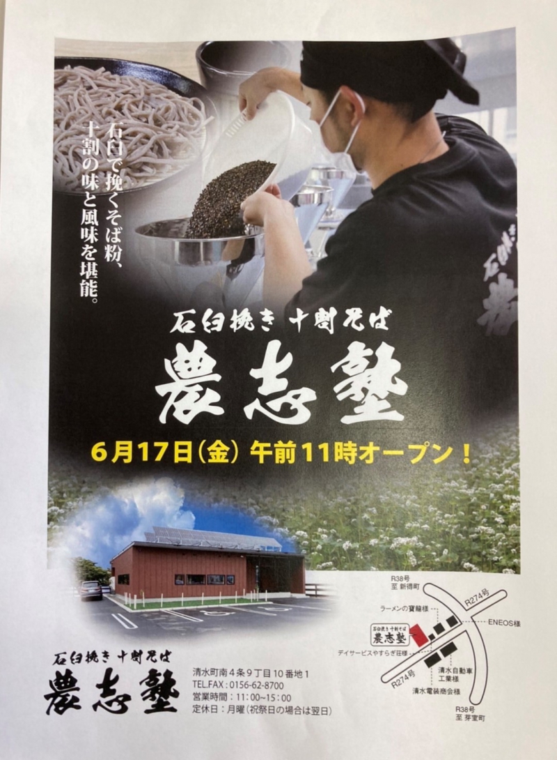 国道274号沿いの清水町南4条9丁目10-1に授産製品販売所として石臼挽き十割そば農志塾及び売店が令和4年6月17日に開店しました。旭山農志塾でつくった10割そばや有機野菜などを直接販売することができるようになりました。営業時間は午前11時から午後3時(ラストオーダーは2時半)で、定休日は月曜(祝日の場合は営業し翌日が休み)です。ご来店をお待ちしております。